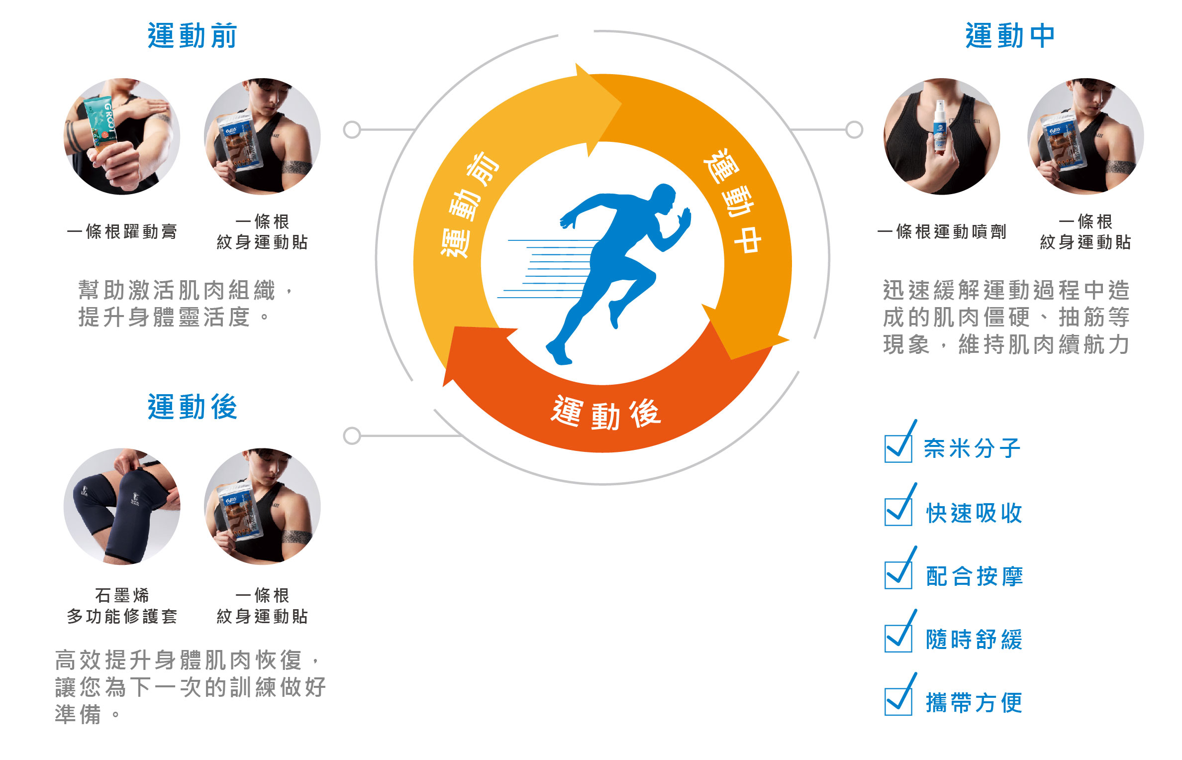 專為運動者設計,針對運動前中後「前、中、後」期的調理保養所規劃研發的漢方草本筋骨型外用保養品