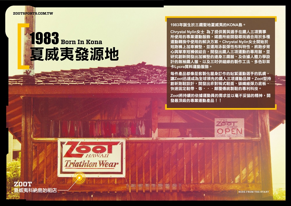 1983年成立,位於三鐵聖地夏威夷的KONA島,由Chrystal Nylin女士創立。她致力於為鐵人三項賽事的菁英選手提供專業運動服飾,不斷尋找適用於多種運動轉換的解決方案。從在短跑褲上加入車褲墊開始,她運用泳裝彈性布料特性,將跑步背心與單車短褲結合,創造出鐵人三項運動的專用服。此外,她還創新地開發出加褲墊的連身三鐵服、根據人體力學設計的無袖鐵人服以及採用三吋併縫線的製作工法。